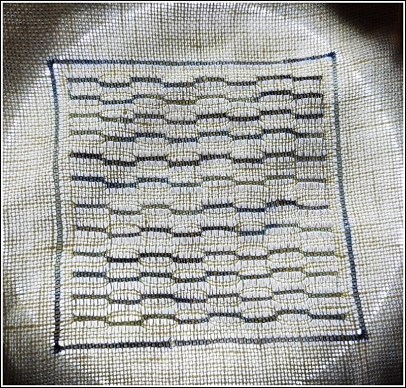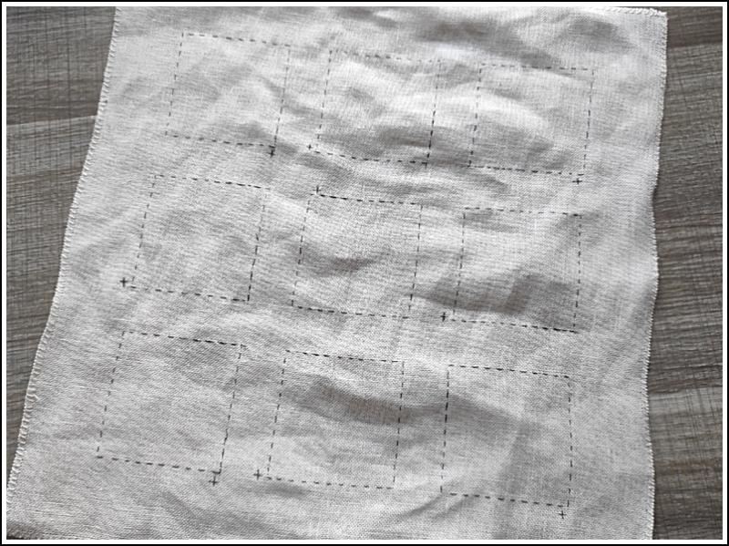Sur de la toile de lin 10 fils, il fallait repérer 9 carrés de 80 fils de côté et séparés les uns des autres par 30 fils.