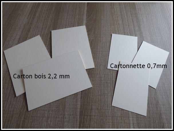 - du carton bois blanc 2,2 mm et 3mm - de la cartonnette 0,7 mm - du papier brouillon pour éviter de mettre de la colle partout. Voici les revêtements dont je dispose :