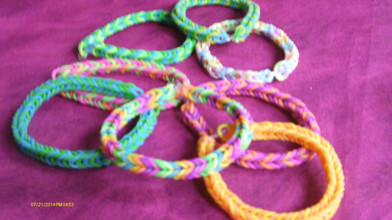 mes dernières créations, les bracelets en élastiques, vite fait, jolies couleurs et pour compléter une tenue d'été sur une peau bronzée ( enfin quand le soleil aura fini de tomber en morceau) c'est très tendance et facile à faire.