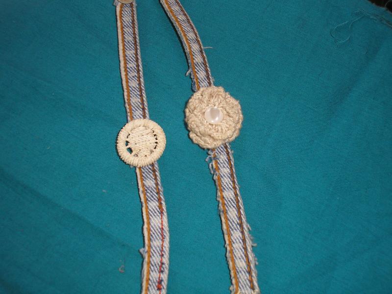 avec des ourlets de jeans et de la pate fimo et des fleurs au crochet