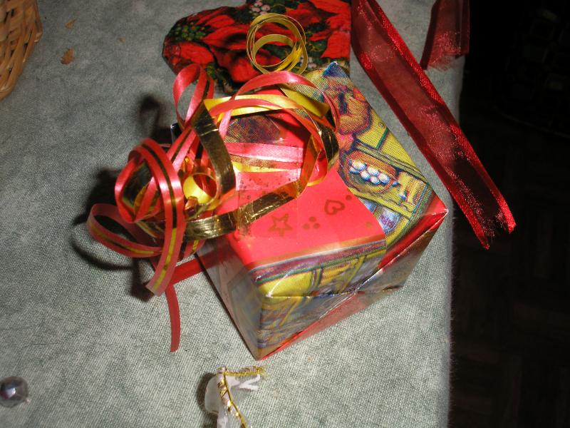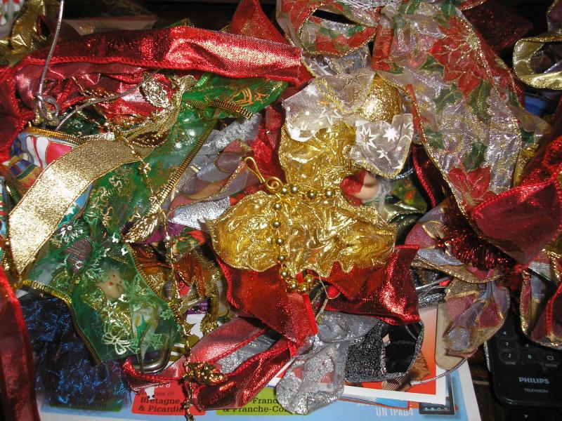 avec du ruban trouvé à la foir'fouille des noeuds avec des petits sujets en bois .