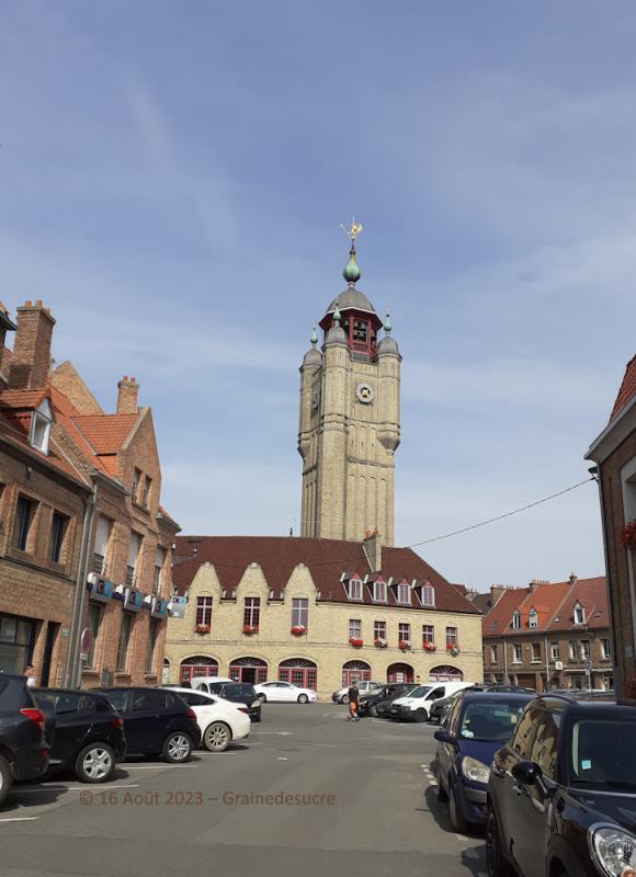 La guerre a détruit l'ancien hôtel de ville et le kiosque à musique. Les architectes Gaston Doisy et Louis Galland en construisent un nouveau de style néo-renaissance flamande en 1935, haut d'une quarantaine de mètres. Il possède un beffroi et un carillon... le prochain châpitre sera consacré à l'hôtel de ville de Dunkerque... à bientôt ....