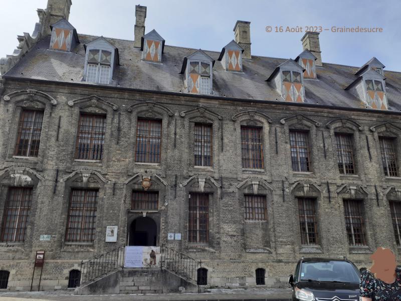 « Joyaux de l’art baroque flamand, le Mont-de-piété de Bergues a été édifié, entre 1629 et 1633, d’après les plans du peintre, architecte, économiste et ingénieur Wenceslas Cobergher (1560 – 1634). Élégant bâtiment rectangulaire de briques parées de pierre, parcouru de fenêtres surmontées d’arcatures, il offre deux remarquables pignons richement décorés. Il a été classé Monument Historique en 1907. » (site du musée https://bergues-musee.fr/ )
