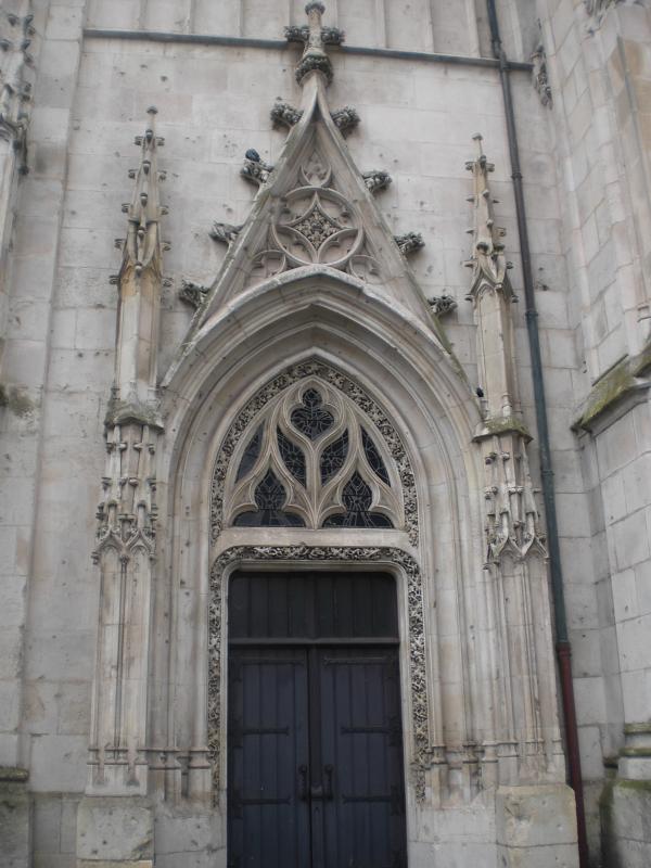 on décide de la refaire totalement sur de plus vastes dimensions. Sa construction commence en 1567; le maître-d'oeuvre Jean de Renneville place le choeur au delà de l'ancien vers l'Est. Mais faute de moyens, les travaux s'arrêtent avant le transept qu'on garde ainsi que les deux travées qui le suivent vers l'Ouest; la troisième est convertie au fil des décennies en passage public, tandis que celles qui avoisinent la tour servent à divers usages civils. Cette église qu'on avait voulu plus grande que la précédente ne sera jamais terminée selon le projet original; seul le choeur est réalisé; espace important avec déambulatoire et chapelles sur tout le pourtour. Comme la population de la ville s'accroît et qu'il devient impossible de continuer la construction vers l'Ouest puisqu'une large voie publique occupe l'espace, Victor Louis propose en 1783 : de convertir l'espace des chapelles de confréries en quatrième et cinquièmes vaisseaux; de reculer les murs Nord et Sud de la profondeur des contreforts pour y loger les autels des confréries : ils y seront adossés aux murs et non plus tournés vers l'Ouest comme jadis on se rend bien compte que la tour était dans le prolongement de l'église.
