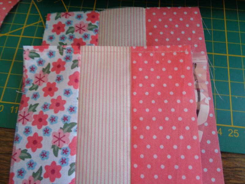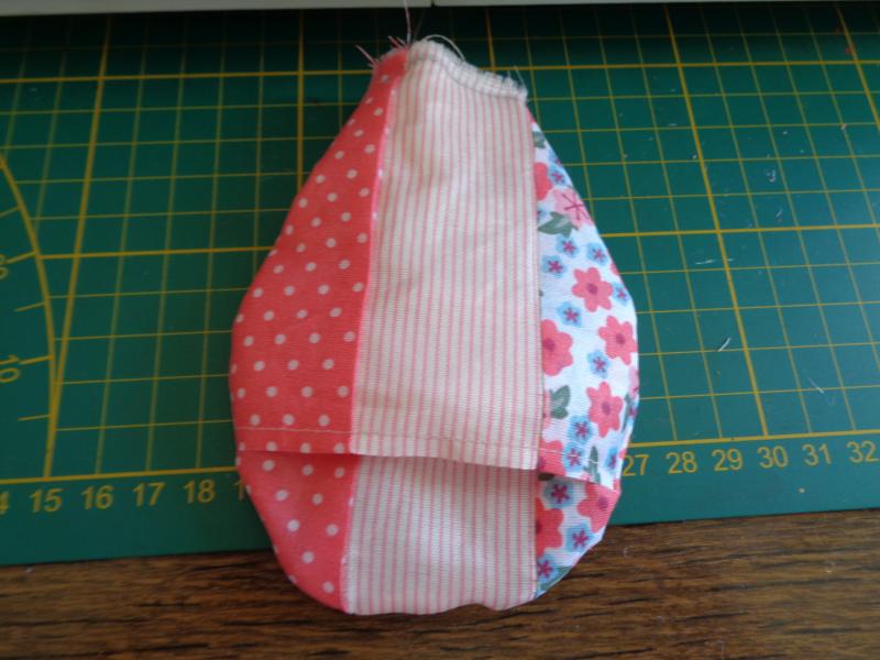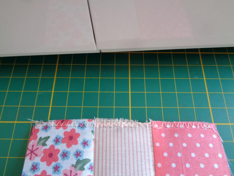 La préparation : découpez des petites bandes de tissu de 4,5 cm x 13 cm : il en faudra 3 de 3 tissus différents puis 2 de quatre autres motifs. Les mesures paraissent bizarres mais c'est un tuto en anglais avec donc des mesures en inches. En plus j'ai tout divisé par deux parce que mon modèle ne doit pas être très grand. Pour ne pas perdre de tissu, j'ai aussi prévu d'en faire trois en même temps, mais les indications que je donne sont pour un modèle bien sûr ! Cousez d'abord 3 x 3 bandes de tissu ensemble dans la longueur... 2ème étape : pliez les 4 x 2 bandes une par une sur le plus long côté. Cousez et prévoyez un angle sur un bout avant de retourner les tuyaux...