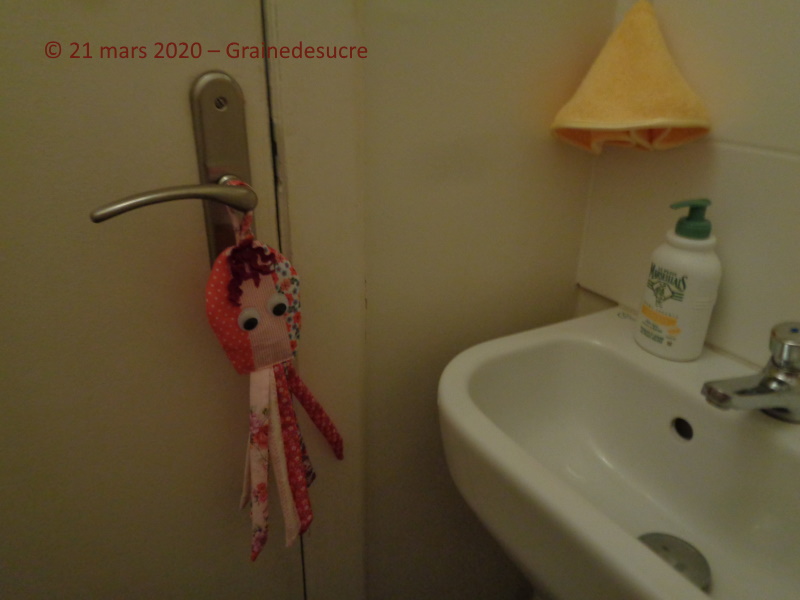 Ensuite, vous imbibez votre coton d'huile essentielle comme sur la photo ci-dessus. J'ai choisi mandarine, parce que c'est un désinfectant et que ça sent bon ! mais vous pouvez mettre menthe, eucalyptus...selon votre choix. Vous le glissez dans le petit sac plastique pour ne pas qu'il tâche le tissu (l'huile est bien sûr grasse) et vous laissez la pochette ouverte. Vous suspendez votre gentille pieuvre à la poignée intérieure de vos WC et chaque fois que vous ouvrirez la porte, le déplacement d'air va venir parfumer ce petit coin intime. Bien moins cher que les produits tout faits, décoratif et asseptisant... Naturel ... Une petite pieuvre qui rend bien service ! |