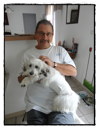 Comme chaque jour (enfin.. presque), Hinès a droit à sa séance de brossage. C'est le travail de Roger. L'avantage avec cette race (je vous rappelle qu'Hinès est un coton de Tuléar), c'est qu'elle ne perd pas ses poils.