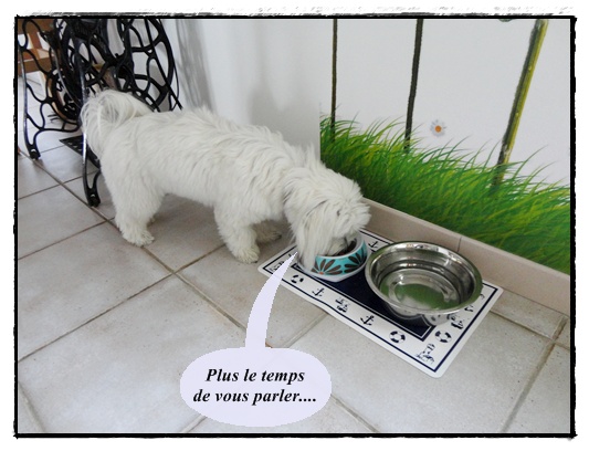 Cela ne l'empêche pas de gambader au jardin et d'être devenue une aide précieuse pour Roger.... Mais courir dans tous les sens, ouvre l'appétit... Alors, aller manger dans la gamelle avec Pirate, c'est rigolo!