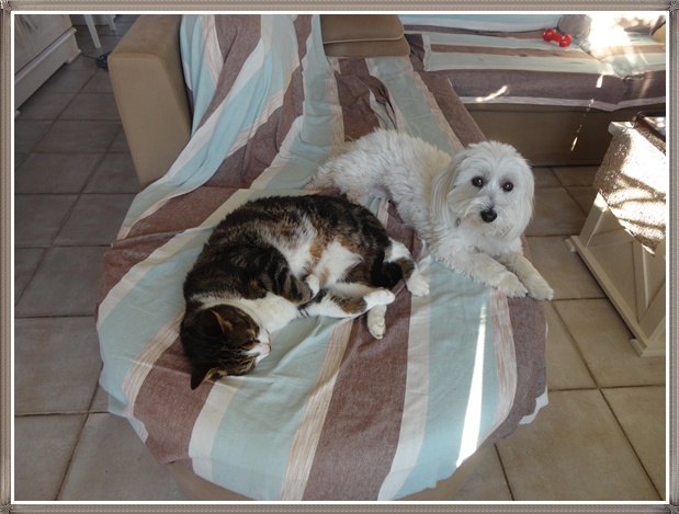 Comme vous le voyez, Pirate et Hinès ont squatté le canapé.... On s'étire, on se chauffe au soleil, on se fait des confidences à l'oreille...