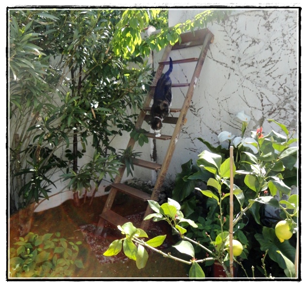 L'échelle de Pirate est opérationnelle et a trouvé sa place. A présent,¨Pirate est bien habitué. Il l'emprunte sans problème. Quand il veut aller explorer le jardin derrière chez nous, il sait qu'il passe et revient par ce chemin-là!