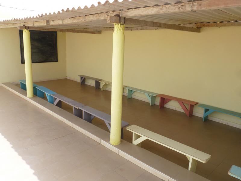 La terrasse ne sert pas seulement à la sieste de début d'après midi. Les activités qui ne nécessitent pas de tables comme le chant ou la lecture de contes sont parfois pratiquées à cet endroit. |