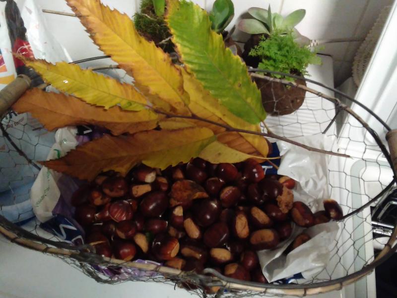cette aprem rando au Mont de Cerisy, j'ai ramassé qq chataignes ,feuillesetc... pour mes compos!