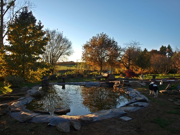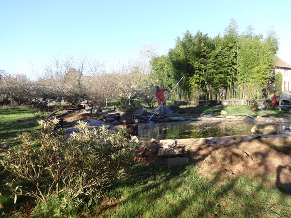 Le bassin se dessine, après le creusement l'année dernière, la bâche a été posée cet été. La mise en eau tout de suite après. Philippe creuse les tranchées pour les tuyaux, la pompe, l'electricité. Les pierres sont positionnées, il faudra encore du temps pour aménager les berges.
