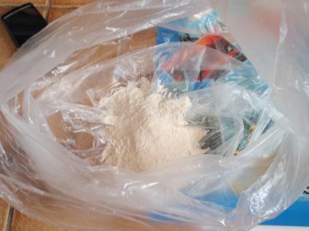 mettre vos poissons ou ce que vous voulez fariner,fermer la poche en la gonflant et secouer de droite a gauche de haut en bas