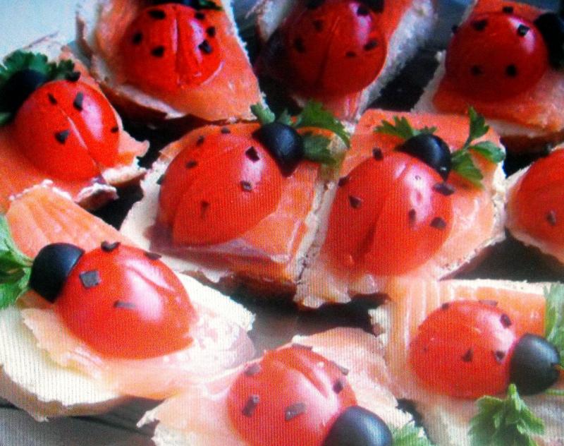 Poser sur chaque carré une petite tranche de saumon, puis une demi-tomate. |