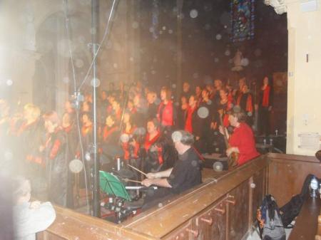 Cette manifestation était organisée par le comité des fêtes dans notre petite église. Ce sont des choristes, des musiciens, des solistes qui transmettent leur énergie et leur bonheur de chanter depuis 1997. C'était une première pour moi et je ne le regrette pas. J'ai été enthousiasmée. Malheureusement mes photos ne sont pas formidables nous n'étions pas très bien placés l'église était pleine de monde. J'ai une photo avec des taches blanches c'est quoi .??? une apparition...!!! dans une église pourquoi pas...!!! Avec mes trois amies nous avons fini la soirée avec un petit kir framboise chez moi. Très heureuse de ma soirée. Bisous |