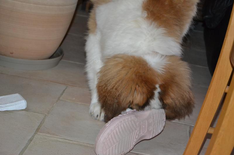 Ben voilà maman arrive, elle n'est pas trop d'accord là !!!!! HA ses crocs faut pas y toucher, de toute façon c'est vraiment trop tard il y a pleins d'empreintes de mes petites dents, bon entre temps je vous signale que j'ai grandi j'ai bientôt 7 mois et plus de 30 kg.