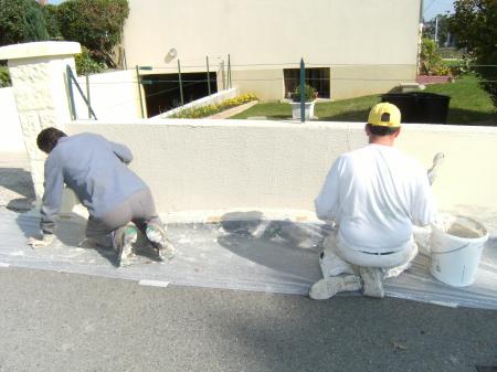 la pose du crepi sur la murrette apres une sous couche de peinture, taloches et truelles sont là pour les aidés