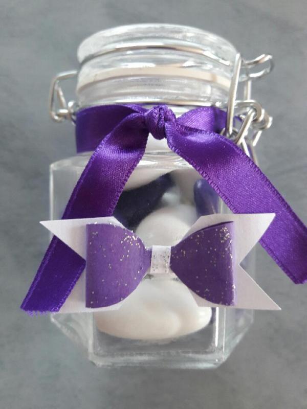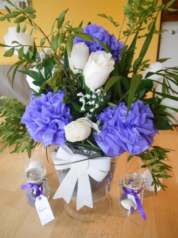 FAIT AVEC DES FLEURS EN TISSUS ET DES FLEURS EN VIOLETTES EN SAC POUBELLE TUTOS PRIS SUR LE NET LES DRAGEES OFFERTES A TOUS LES INVITES