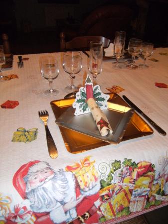 et un autre decore le repas était aussi bon que la veille : Apéritifs, toasts maison, tartine de foie gras sur du pain grillé, antilope aux chataignes et pomme noissettes, salade, fromage buche glacé au nougat offert par Jérôme, thé, café et evidement petits chocolats de Noel |