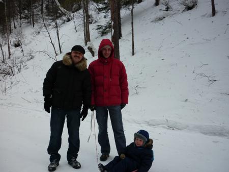 Bonjour. Chez nous ,,la chaleur,,! seulement -10! Notre Anton avec son papi et son papa. Bonne balade de dimanche dans le bois.