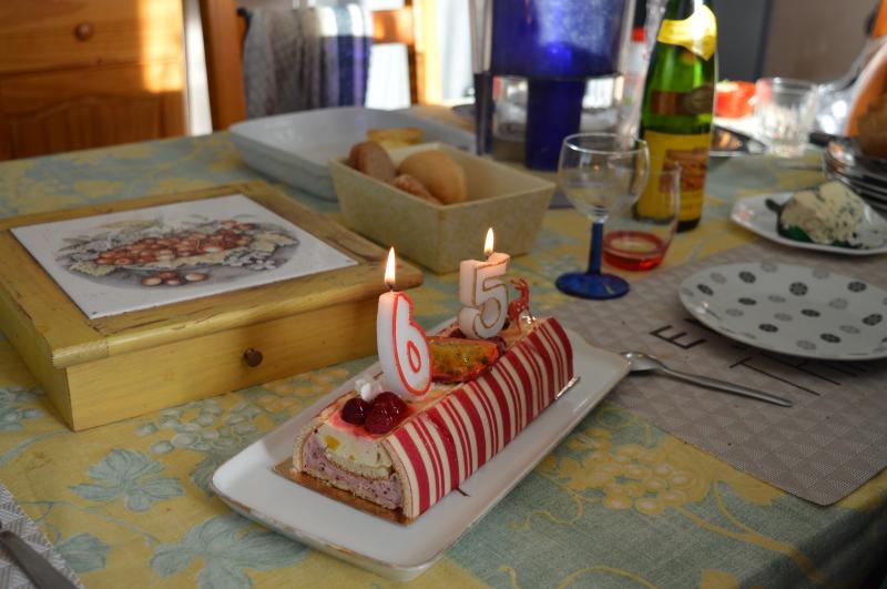 et pour l apéro une 2ème surprise, mon fils et ma belle fille avait fait la route pour venir diner à l improviste avec nous et surtout pour souffler les bougies des gâteaux car ma fille (dans la confidence en avait acheté 2 mais je n avais pas assez de bougies alors elle a mis mon âge sur l un et mon année de naissance sur l autre!!!!!!!!!!!!!!)