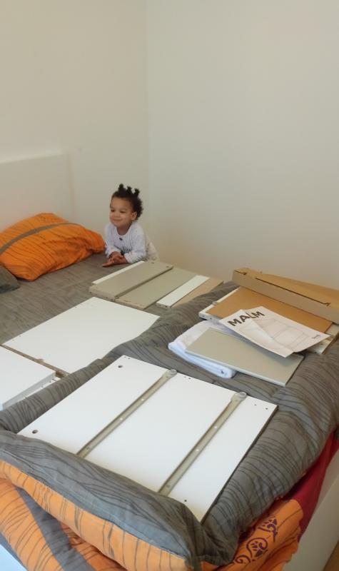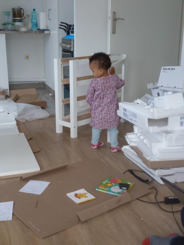 arrivées sur place ma fille a fait faire connaissance de la nouvelle maison à TAZ avant de l enfermer dans la pièce d eau afin de ne pas l affoler lors de l arrivée des"déménageurs" - MILA et sa nounou d un jour partait pour leurs occupations et Jennifer, sa belle-mère, sa belle-soeur et moi nous retroussions nos manches pour enlever papiers et tâches de peintures puis les hommes sont arrivés avec un 1er chargement qu il a fallu répartir dans les pièces - en fait il y avait surtout des cartons car l essentiel des meubles étaient neufs et avait déjà été livrés sur place puis nous avons déjeuner sur la terrasse et une partie des hommes sont repartis chercher le reste des affaires, passer à la décharge jeter tout ce qui ne devait pas "migrer" pendant que mon mari et mes filles se chargeait de monter le living, les étagères, le lit, et le meuble télé - nous avons fini le soir vers 19 h 30 après un petit apéro - en laissant la petite famille savourer sa première nuit de nouveaux propriétaires.... heureusement nous avons eu une journée magnifique, un peu chaude car aujourd hui il tombe des cordes malheureusement j avais oublié mon appareil photo et je n ai pu utiliser que le téléphone portable de mon mari donc peu de souvenirs de cette journée et surtout de la nouvelle installation cela sera pour notre 1ère prochaine invitation!!!!!