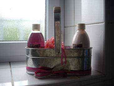 et mon fils Emmanuel, m a offert ce petit panier en zinc qui contenait un gel douche, du lait pour le corps, des sels de bain, une fleur de douche massante le tout parfumé à la mûre - nous avons passé une bien belle journée avec en plus le soleil qui est revenu juste à temps pour le barbecue et permettre aux enfants et au chien de jouer sur la pelouse toute l après midi