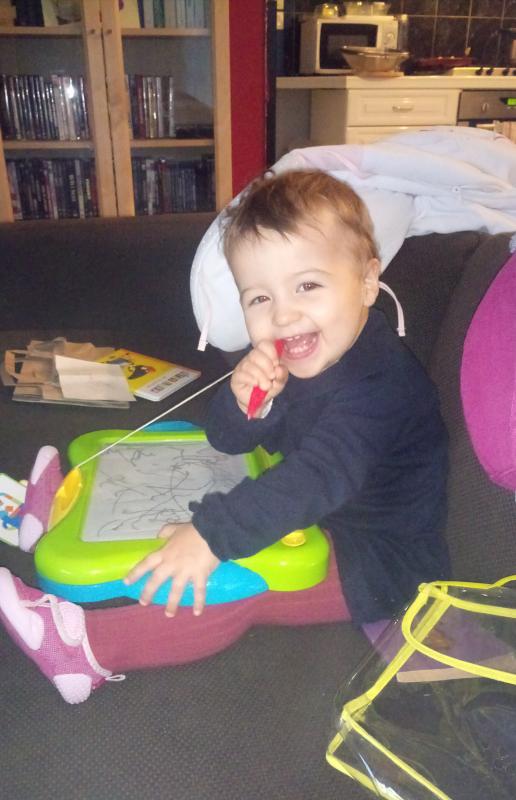 samedi ma fille et Mila étaient venues passer la journée avec nous pour notre rendez vous beauté - pour l occasion mon mari avait bien nettoyé le "sittatout" que nous avions conservé de l enfance de Romain et l avait rentré - aussitôt arrivée Mila a été installé dedans et croyez moi elle était heureuse de pouvoir participer ainsi -