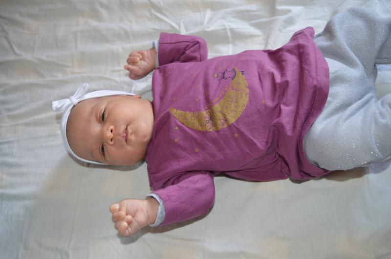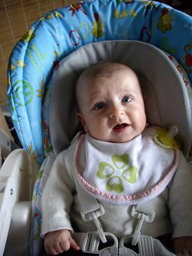 elle continue à bien évoluer et devient de plus en plus réactive - elle est très curieuse et supporte assez mal de devoir dormir dans sa chambre alors qu au salon il y a du monde - donc elle se manifeste bruyamment dès que sa maman la met, endormie, dans son berceau - elle aime bien dormir dans les bras mais "en compagnie" -