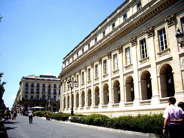 APRES LA PLACE DE LA BOURSE NOUS SOMMES REMONTES PAR LE COURS DU CHAPEAU ROUGE JUSQU A LA PLACE DE LA COMEDIE SUR LAQUELLE ON EUT ADMIRER LE TEMPLE DES MUSES OU LE GRAND THEATRE COMMANDE PAR RICHELIEU (ALORS GOUVERNEUR DE GUYENNE) EDIFIE PAR VICTOR LOUIS FUT INAUGURE EN 1780 AVEC LA REPRESENTATION DE ATHALIE DE RACINE - DE STYLE NEO CLASSIQUE IL MESURE 88 X 47 M. ET ABRITE UNE SALLE "A L ITALIENNE" DE 1000 PLACES - SA FACADE EST PRECEDEE DE 12 COLONNES CORINTHIENNES SURMONTEES D STATUES DE PIERRE REPRESENTANT LES 9 MUSES ET 3 DEESSES : JUNON-VENUS-MIVERVE - IL ABRITE L OPERA DE BORDEAUX ET L ORCHESTRE NATIONAL DE BORDEAUX AQUITAINE