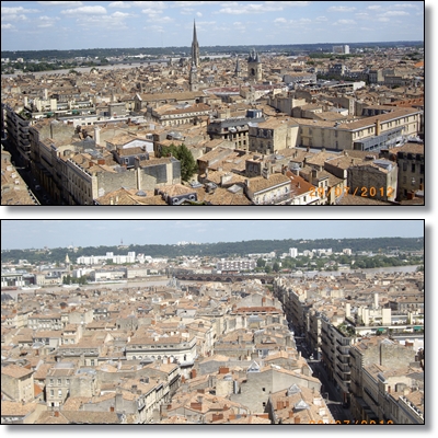 une petite idée de la longueur de ses quais avec ce petit panorama qui va de la tour Saint MIchel clocher de la Basique du même nom - quartier "populaire" de Bordeaux où l on retrouve toutes les communautés - cette tour détachée de l Eglise elle même s élève à 114 m. et sur les contreforts on peut admirer les statuts de 6 prélâts aquitains - l église est du XIV et XVI - (j y retournerai pour vous)