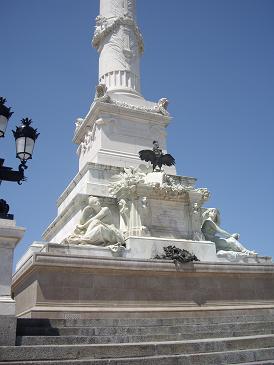 à l opposé, côté Garonne et pour faire un "balcon" sur le fleuve, les colonne rostales : hautes de 21 m. chacune est ornée de quatre proues de galères prolongées de rostres formés de deux faisceaux de trois glaives qui signifient la maîtrise triomphale des mers (en souvenir des victoires romaines sur celles de Carthage) - au dessus figurent les symboles de la Marine et du Commerce - et sur les chapiteaux on y retrouve des symboles représentant le Commerce et la Navigation - et depuis les quais cela fait une belle perspective