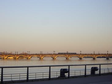 côté fleuve, on voit bien le Pont de Pierre construit de 1811 à 1829 qui comporte 17 arches et mesure 500 m - le pont a été élargi en 1954 puis on a consolidé les arches centrales pour permettre aux barges de l Airbus de passer et enfin plus récemment le tram qui relie les deux rives - le tram circule au centre puis une voie de circulation voitures + une piste cyclable dans chaque sens