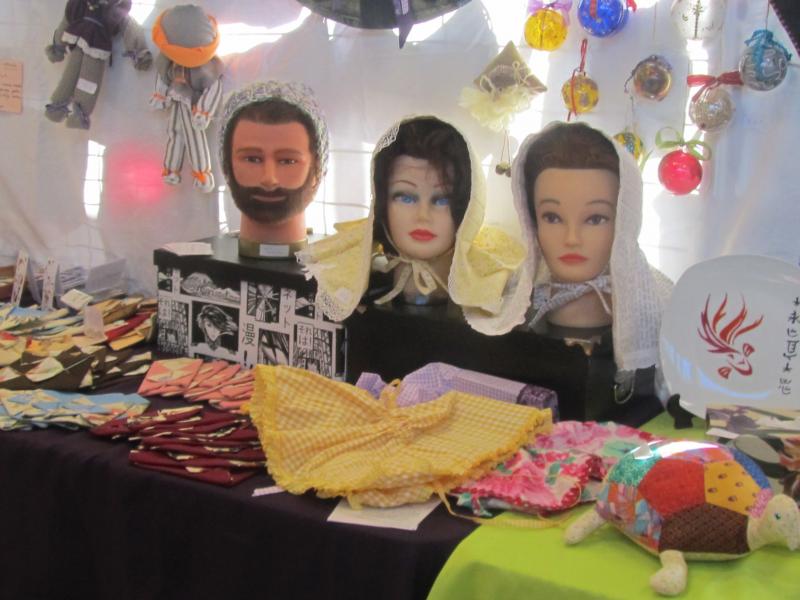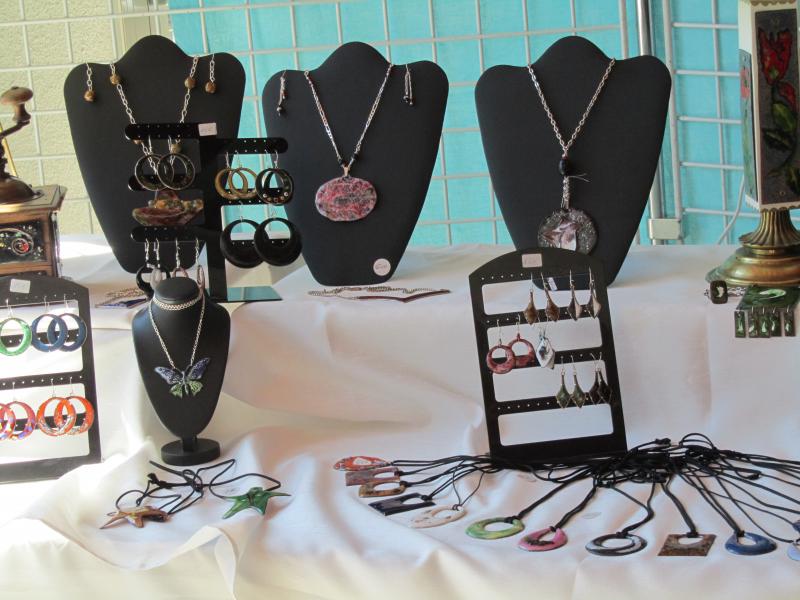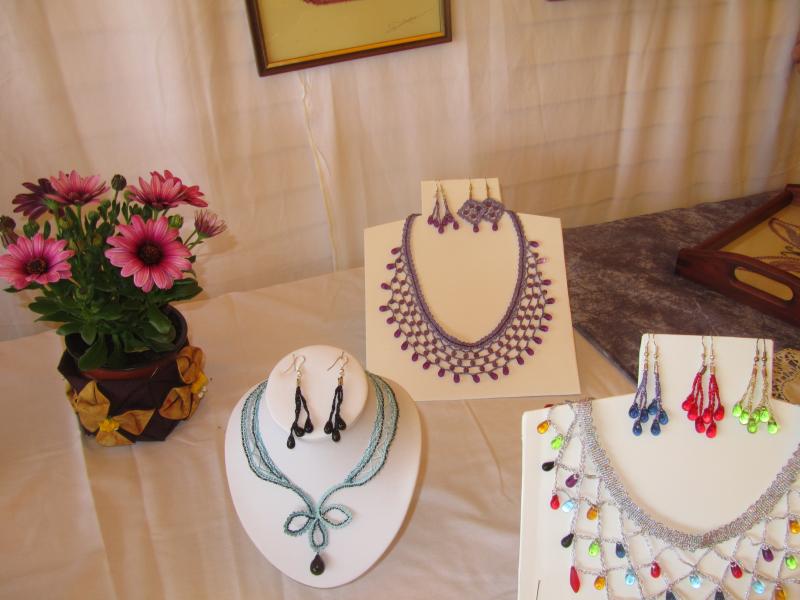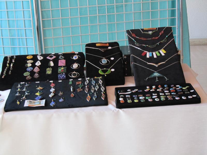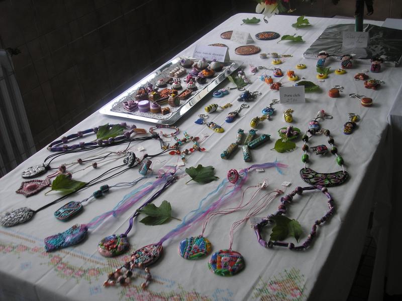avait quelquesexposants . voici la table de gigi qui m'avait accompagnée avec tous ses beaux bijoux