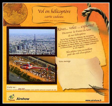 Alors pour immortaliser cette journée, ma fille m'a offert un cadeau des plus inattendu et que j'apprécie beaucoup "un vol en hélicoptère" !!!!!! RV est donc pris pour le 7 août, à la Ferté Alais ce sera pour moi une journée inoubliable.
