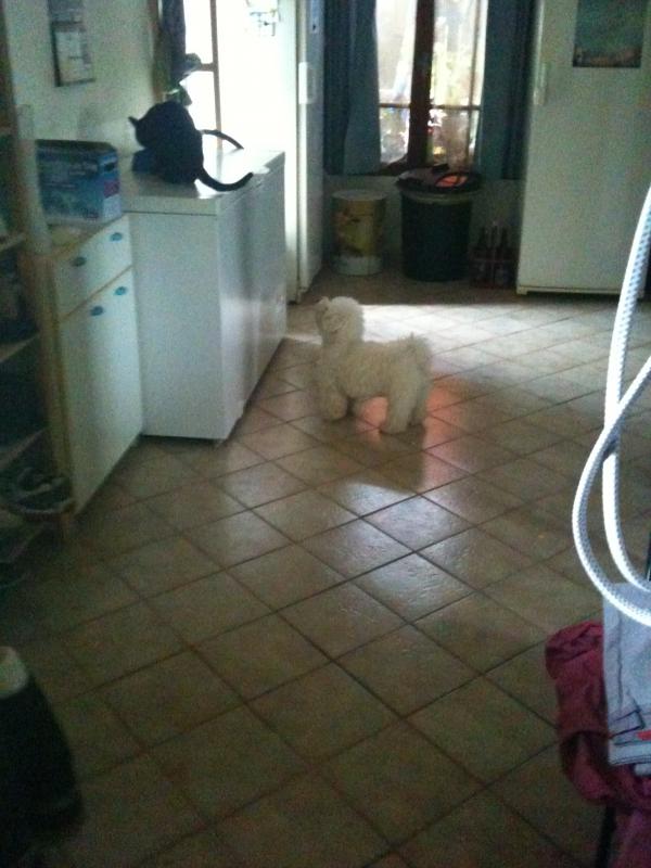 donc comme je suis fatiguée, je vous dirais que mon prorpio s'est pointé ce matin vers 10h30 et que tout mon repas a été en arrêt!!! car je ne savais pas quand il allait partir?? donc St Jacques à la crème "façon cloclo" paupietttes de veau que j'avais mis dans le four à mijoter avec purée faite maison, et gateau fait hier!!! et après tout ceci, étant sur les nerfs, ne sachant pas à quelle heure il allait finir, je suis partie me balader avec Hilane et Mr à la sieste, en rentrant direction salle de bain pour Hilane et Bibi casséééééééééééé |