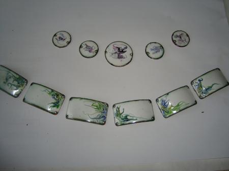 Des plaques émaux fixées sur le pied, regarder le moulin à café, il est ravissant Compositions de colliers. Une tulipe avec cloison Composition entiérement  créer, des perles de pocelaine |