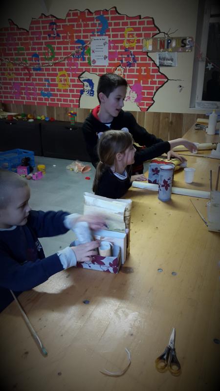Dans la plus petite boite, prendre des rouleaux de papiers toilettes les décorer aussi et les mettre dans la plus petite boite pour mettre des crayons, stylos.....