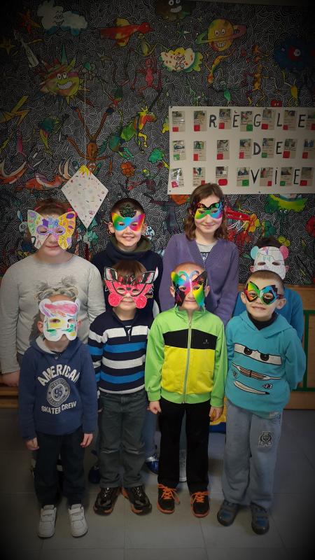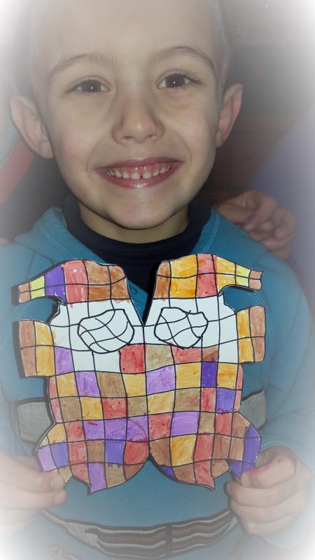 Dessiner un éléphant en symétrie et y tracer des traits verticaux et horisontaux de façon à faire des carrés et les colorier de 5 couleurs en alternant bien les cases Le plier et y mettre un oeil obile de chaque côté et nous les avons plastifié