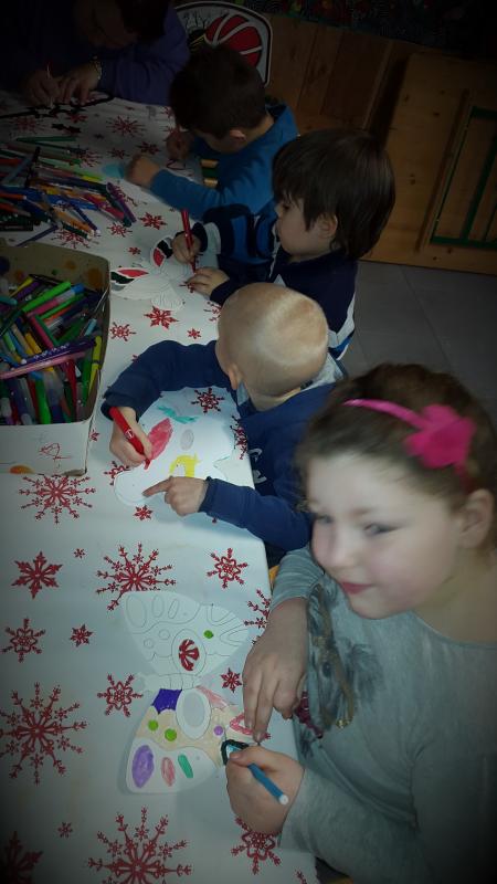 Sur une feuille blanche, différentes parties du pantin que nous avons colorié et collé sur le carton et nous avons tout découper et assembler avec des attaches parisienne.