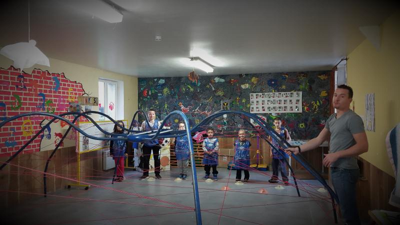 Le but était par équipe de passer sans toucher les fils et de traverser l'araignée. Très sympas les enfants ont adoré.