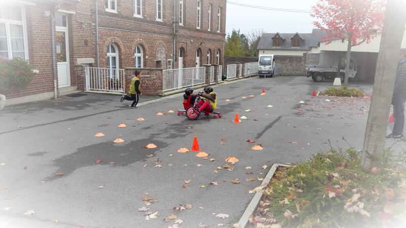 Petits vélos à 3 roues mais celles de derrières tournent à 360 degré. 2 équipes bien équipés casques obligatoire.