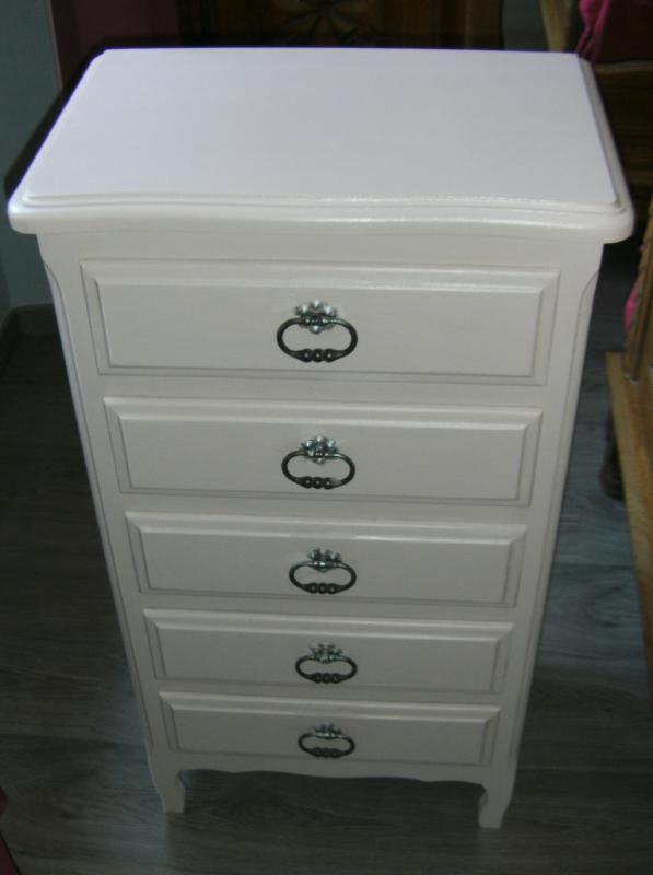 Sur ma sous-couche bien sèche, j'applique avec un pinceau plat (ou à bout pointu en cas de recoins) ma peinture wood paint (ou toute peinture acrylique) en 2 couches à 4heures d'intervalle). Je vernis avec un vernis acrylique en une à 3 couches à 1heure d'intervalle. ( un exemple pour un meuble juste peint et vernis avec la photo ci-dessus) J'aime bien aussi les peintures à effet moins épaisses (comme le SPARKL ou les peintures Esprit Chic) mais qui laissent passer les veines du bois, selon la nature et l'état du bois que je veux décorer.