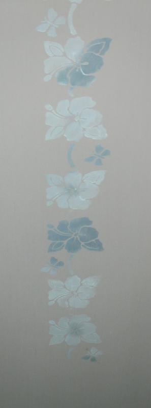 J'avais peint ce miroir en bleu ciel, patiné avec une patine acrylique 'venitian', un coup de rouleau imprimeur pour les motifs et avec un petit rouleau, j'ai passé sur l'ensemble un coup léger avec un petit rouleau mousse imprégné de peinture argent.