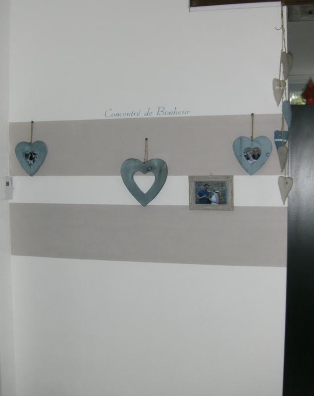 Je le trouvais un peu trop foncé pour l'endroit où il trône maintenant, j'avais envie de le relooker depuis un certain temps. Me voilà décidée: un peu de peinture blanche pour l'intérieur ..... Des coeurs en bois de 2 dimensions, de la peinture grise et nacrée.