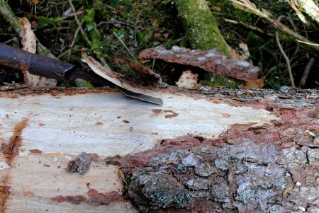 Après avoir écorcé l épicéa,benjamin fait deux entailles pour délimiter la longueur de la sangle et à l'aide d'une "cuiller",commence a lever les sangles.