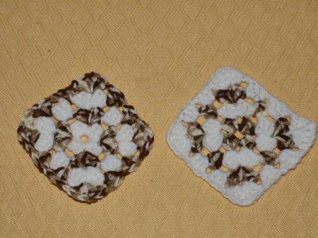 En faisant du shopping avec mon homme dans les magasins samedi j'ai trouvé de la laine qui me plaisait beaucoup, alors je l'ai acheté sans trop savoir ce que j'allais commencé, pas envie de me "prendre la tete" à compter mais toujours cette envie de m'occuper les mains l'apres midi. Alors j'ai cherché des modèles de carré au crochet, j'ai trouve un carré tout simple à faire, c'est le modèle utilisé pour les patchwork américains, sauf que je n'utilise que deux couleurs car pas envie de ressembler à un clown ensuite car j'ai décidé de confectionner "au pif" un pull pour moi composés de carrés. Les photos vont venir un peu plus tard la laine