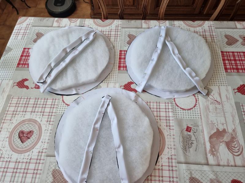 Découpez également des cercles de buttinette. Ces cercles seront 2 cm plus petits. Découpez des bandes de 40 cm sur 7 cm (cela peut varier en fonction de la taille de la galette et de la chaise).
