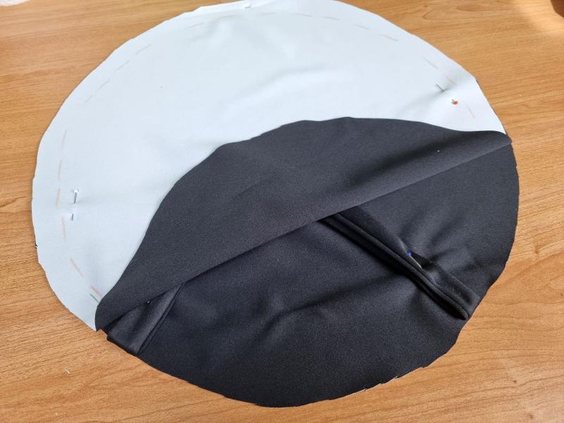 C'est à cet endroit que vous mettrez les bandes qui serviront à attacher la galette sur la chaise. Épinglez les bandes pliées en deux sur les repères puis placez les cercles endroit sur endroit. Piquez tout le tour en insistant sur les bandes et en laissant ouvert un espace entre les deux bandes.